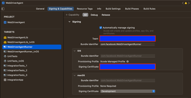 3. Select WebDriverAgentLib from the Target tab and check to select "Automatically manage signing" in the "Signing & Capability" tab and then select your Development Team. This should also auto-select the Signing Certificate. The outcome should look like this: