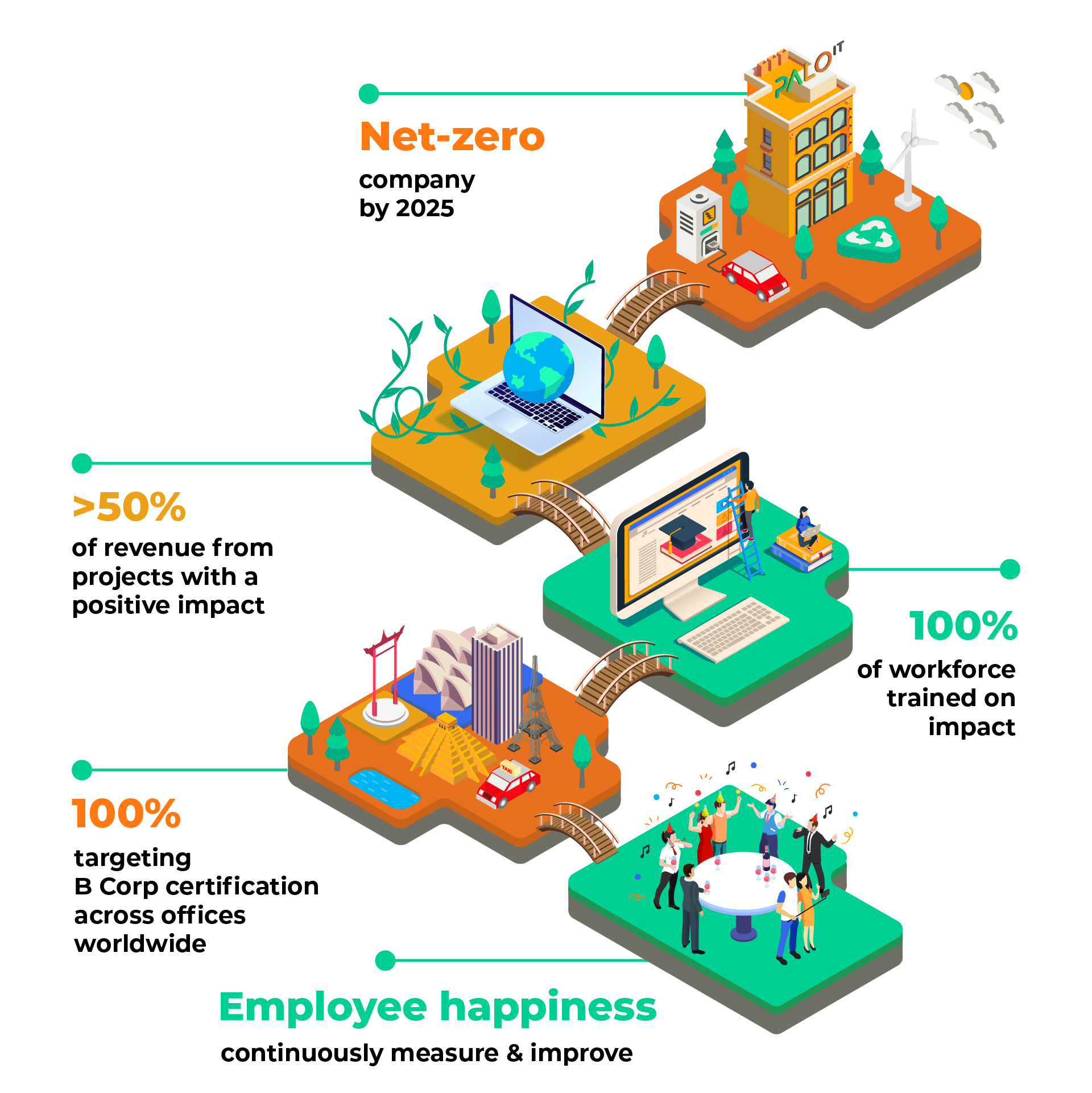 Até 2025, nosso objetivo é que a maioria de nossa receita venha de projetos que tenham um impacto positivo em nosso mundo. Continuaremos a buscar estratégias de desenvolvimento de negócios e oportunidades de projetos, além de aprimorar nossos métodos e modelos de entrega para atender aos Objetivos de Desenvolvimento Sustentável da ONU.