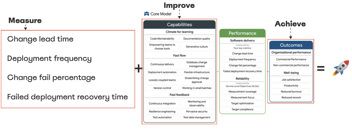 After understanding this, the team will present a list of actions consisting of quick wins and strategic initiatives to improve maturity. To measure back the success, they will see an improvement in the DORA metrics.