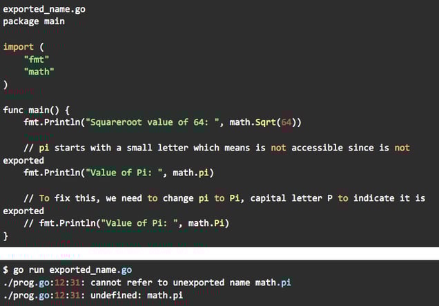 When we import a package, we can only access its exported names. Usually in the form of type, function or variable, an exported name must start with a capital letter in order to be visible outside the package. Otherwise, it will NOT BE accessible outside the package.