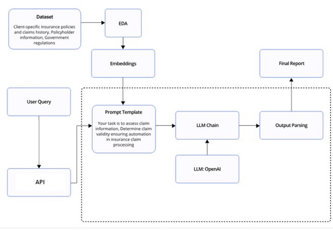 Furthermore, with the help of embeddings, the OpenAI LLM is capable of offering deep insights, conducting a thorough review to detect any potential signs of fraud, and providing actionable recommendations for the claim.