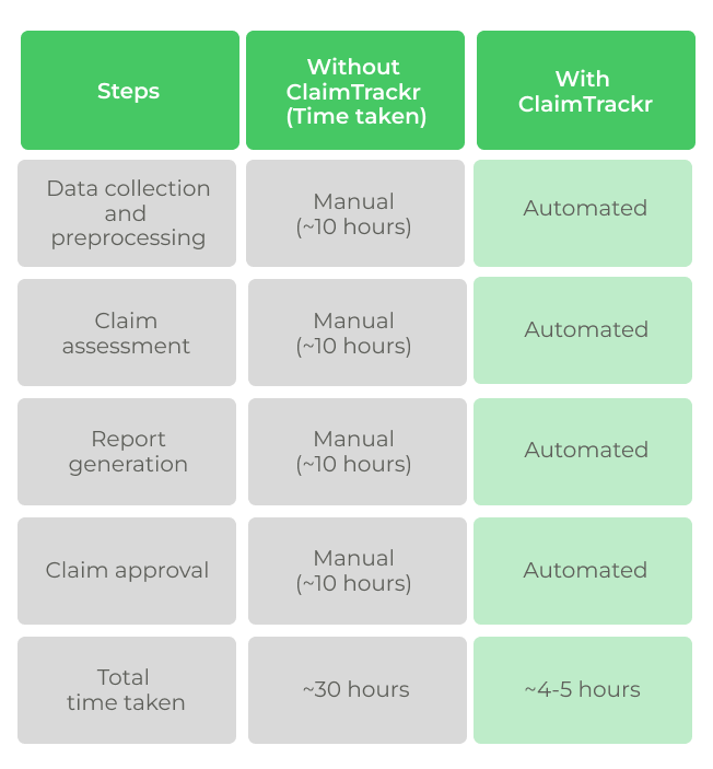 Leveraging the power of artificial intelligence and machine learning, ClaimTrackr automates the traditionally manual insurance claim processing procedure. Here’s a comparison of the time required for each task with and without ClaimTrackr Flow:
