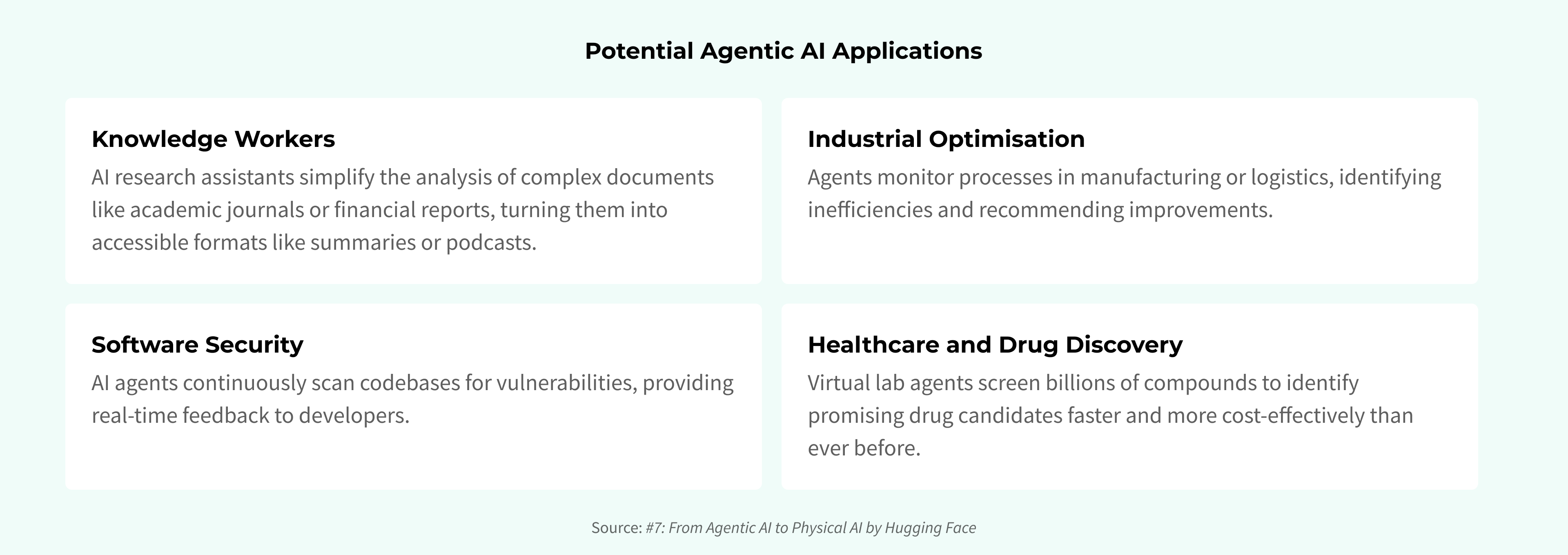 At CES 2025, Nvidia's CEO highlighted advancements beyond generative AI, introducing agentic AI — autonomous systems capable of independent decision-making (e.g., pharmaceutical discovery) — and physical AI, autonomous machines that interact with the physical world (e.g., Waymo’s robotaxi and Tesla’s Optimus humanoid robots).