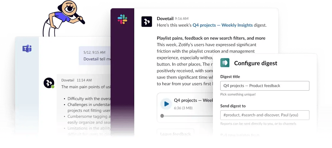 Slack and Teams Integration with Dovetail that allows colleagues to extract insights easily from the chat-based interface (Image source: Dovetail).