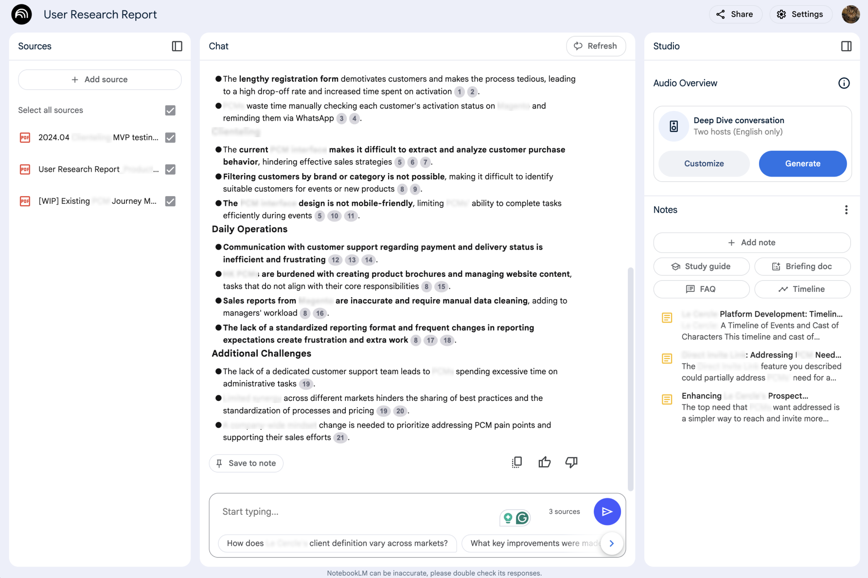 To address these challenges, tools like Google NotebookLM and Dovetail can be valuable. Google NotebookLM is an AI-powered research assistant that summarizes and generates fact-based insights from the data you provide, serving as a knowledge base for user research.