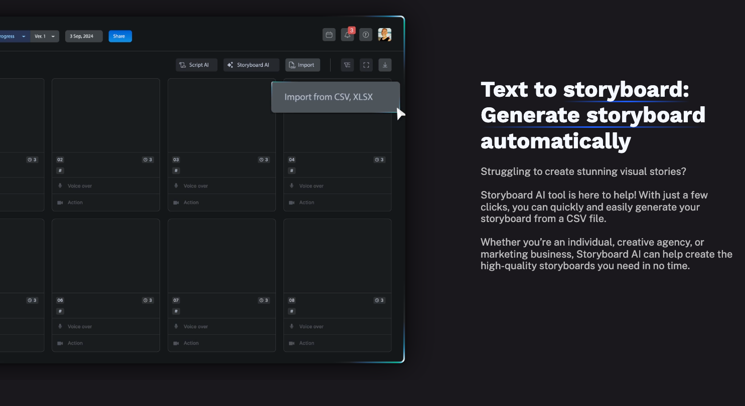 Storyboards.AI creates storyboards by specifying characters, story flow, and actions through prompts. Storyboard AI from KROCK.io simplifies the process further with an Excel upload function that can generate the storyboard in minutes.