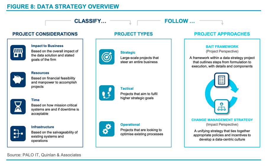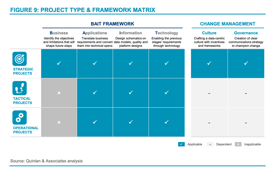 There are several tools that companies can use to determine the size and scope of a project while bringing lasting adoption of data to an organisation. These are: the project classification, the BAIT (Business, Application, Information, Technology) framework, and change management strategies (see Figure 8).