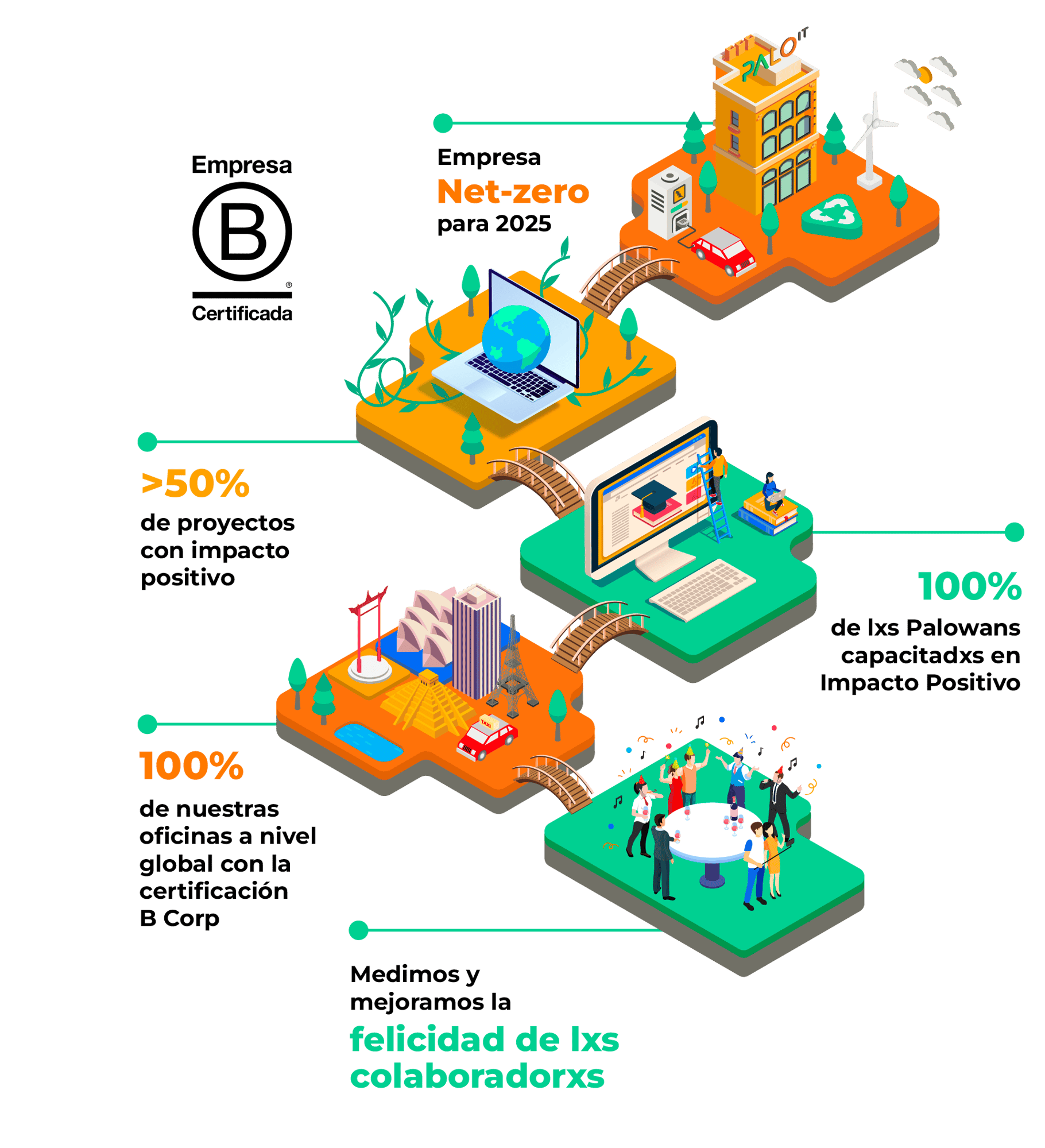 Obtener la certificación B Corp es para valientes. ESta certificación, nos sirve como marco para desafiar continuamente nuestras prácticas y mejorar nuestras formas de hacer negocios con un propósito claro y profesional. Nuestro objetivo es que cada una de nuestras oficinas obtenga la certificación B Corp, y continuaremos mejorando nuestra calificación en las oficinas previamente certificadas. A medida que seguimos creciendo, B Corp servirá como una guia constante para orientar a nuestros equipos, que provienen de más de 50 nacionalidades de todo el mundo, guiándonos con confianza y autoridad hacia un futuro más sostenible.
