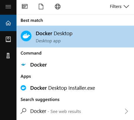 Docker Desktop no se inicia automáticamente después de la instalación. Para iniciar Docker Desktop, busque Docker y seleccione Docker Desktop en los resultados de la búsqueda.