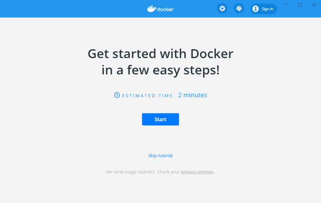 Cuando se completa la inicialización, Docker Desktop inicia el tutorial de incorporación. El tutorial incluye un ejercicio simple para crear una imagen de Docker de ejemplo, ejecutarla como un contenedor, empujar y guardar la imagen en Docker Hub.