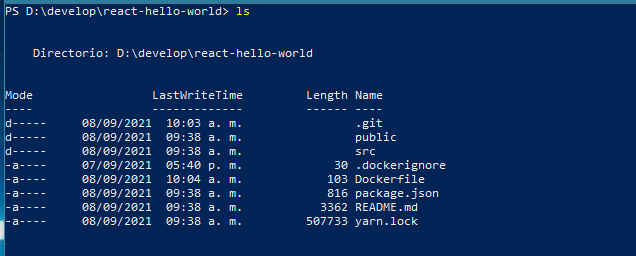 - Nos dirigimos a la carpeta donde tenemos el código de nuestra aplicación y el Dockerfile y listamos el contenido.