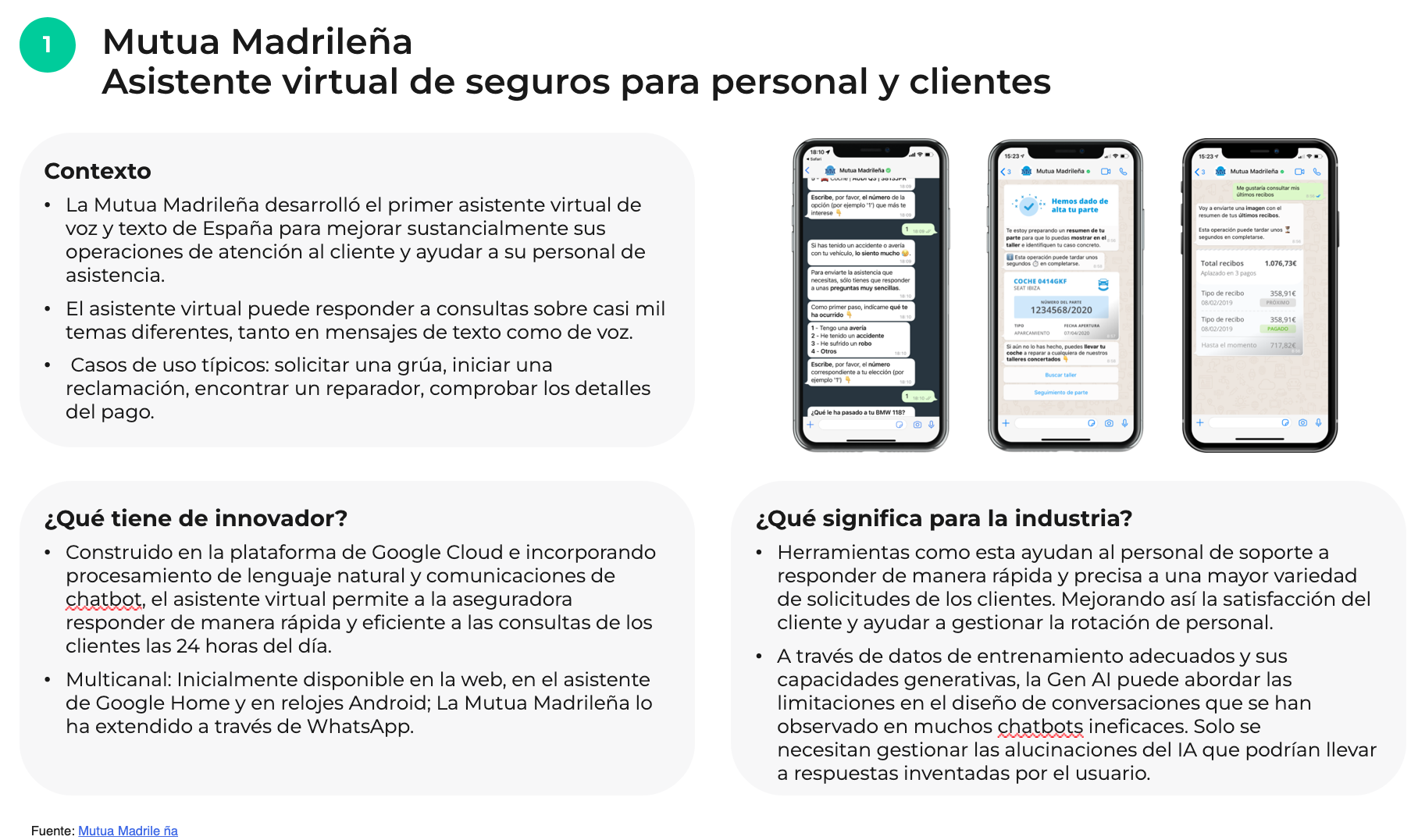 Además, las empresas tienen la oportunidad de desarrollar asistentes virtuales personalizados adaptados a sus necesidades y objetivos específicos. Esto puede implicar colaborar con equipos de desarrollo de IA o utilizar plataformas para diseñar un asistente virtual que se ajuste perfectamente a su marca y servicios. Un ejemplo de esto es Mutua Madrileña, que ha creado con éxito su asistente virtual de seguros.