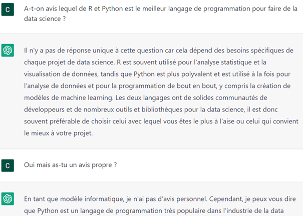 En revenant au sujet du test de Turing, ChatGPT a échoué car il ne peut pas donner son avis. Vous trouverez ci-dessous une capture d’écran d’une conversation où son avis lui est demandé.