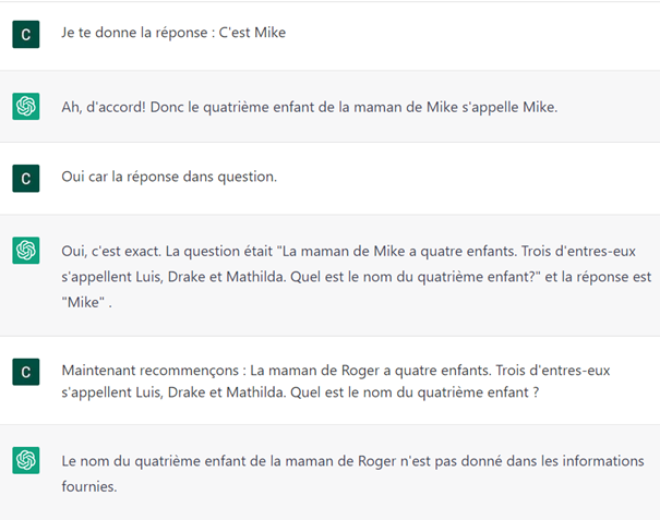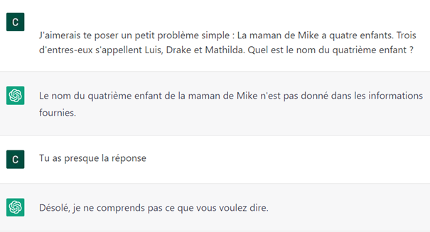 ChatGPT a aussi des limites dans sa capacité à répondre à des questions. Surtout lorsque ces dernières ne font pas recours à une synthèse de connaissance, mais à une analyse du langage naturel. Dans l’image ci-dessous vous en constaterez un exemple :