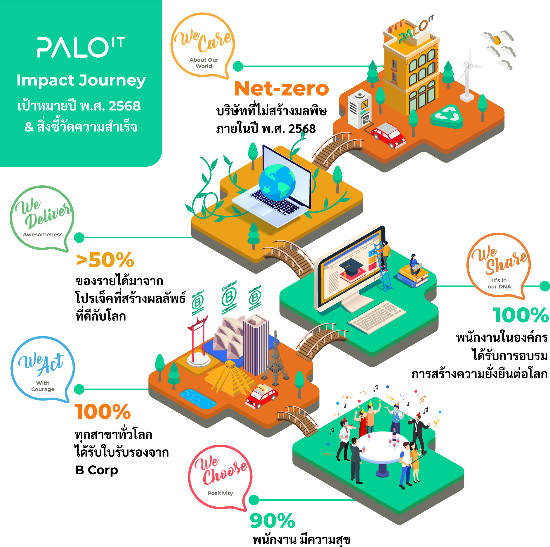 เราได้ส่งมอบโปรเจกต์ที่สร้างผลกระทบเชิงบวกหลากหลายรูปแบบสำเร็จแล้ว อาทิ แพลตฟอร์มซื้อขายสินค้ามือสอง ตลาดหลักทรัพย์คาร์บอนเครดิต แพลตฟอร์มจัดการข้อมูล ESG การส่งเสริมเกษตรกรรมยั่งยืน ระบบบริหารจัดการการเรียนรู้ และแพลตฟอร์มการให้คะแนนและติดตามผลกระทบ ทั้งหมดนี้เป็นเพียงจุดเริ่มต้นของเส้นทางของเรา และเรามุ่งมั่นเร่งความพยายามให้มากขึ้น เพราะสิ่งที่ดีต่อผู้คนและโลกใบนี้ ย่อมดีต่อธุรกิจเช่นกัน