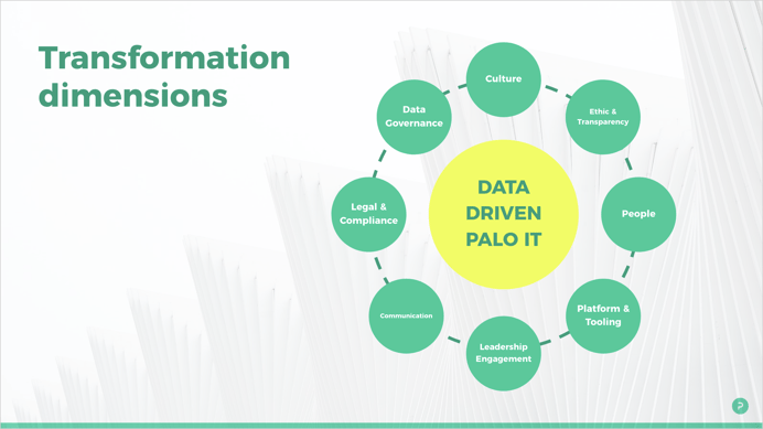 เพื่อรับมือกับความไม่สมดุลที่มีอยู่นี้ เราได้เริ่มต้นกระบวนการ Data Transformation ในช่วงต้นปี ซึ่งเป็นกิจกรรมที่ปรับรูปแบบของการที่เราดำเนินงานที่ PALO IT และเร่งความเป็นต่อทางธุรกิจของเราให้ขึ้นมาอยู่เหนือชั้นกว่าคู่แข่งของเราได้ การเปลี่ยนแปลงที่สำคัญ 5 ประการที่เราตั้งไว้ว่าจะต้องบรรลุให้ได้ก็คือ: